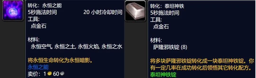 比较赚钱的只有转化永恒之能和转化泰坦神铁,前者定位类似70级源生之能,后者定位类似60级奥金锭市场需求量极大。在原始WLK版本中3.3.5升级补丁取消泰坦神铁锭的转化CD,不过没关系后期版本炼金更赚钱。