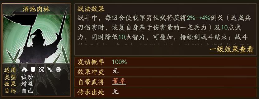 自带战法酒池肉林,经过新一轮的改版之后变得面目全非,几乎就是重新设定的。第一段内容,每回合随机使男性武将获得4%倒戈,叠加之后最高倒戈回血32%。第二段内容,每回合随机提升男性武将10点武力、降低10点智力,就是让武夫更勇的同时变得更弱智。第三段内容,从第五回合起,开始不分敌我地揍人,伤害率60%—68%,但是不打自己的女人,估计是那些年被吕布伤得太深了。