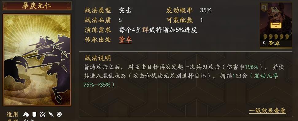 传承战法暴戾无仁,是一个性价比非常高的突击类战法。虽然发动率只有35%,但是使用时一般都和虎豹骑搭配,能提升到45%,张辽带的话能到60%。伤害接近200%可圈可点,关键是具备混乱技能,是一个可以创造奇迹的控制效果,会让战斗变得一切皆有可能。