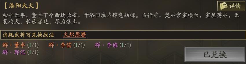 在洛阳大火事件中,可以用五星董卓、李儒和四星李傕、郭汜,兑换事件战法火炽原燎。