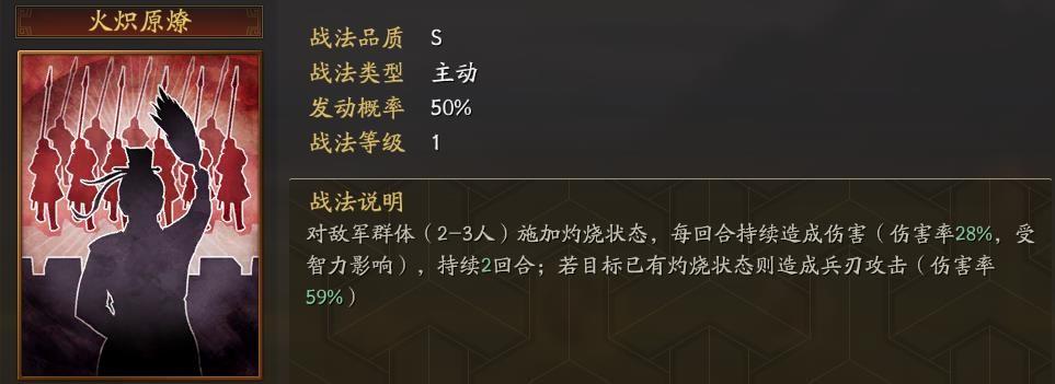 火炽原燎作为主动战法,拥有高达50%的发动概率,而且是瞬发的灼烧效果。覆盖面2到3人,持续伤害率28%以上,有燃烧效果的情况下改为59%的兵刃输出,特别适合姜维、SP袁绍、SP朱儁等智勇双全的武将。每发动一次都能带来巨大的收益,而且发动的越多,收益也就越高。