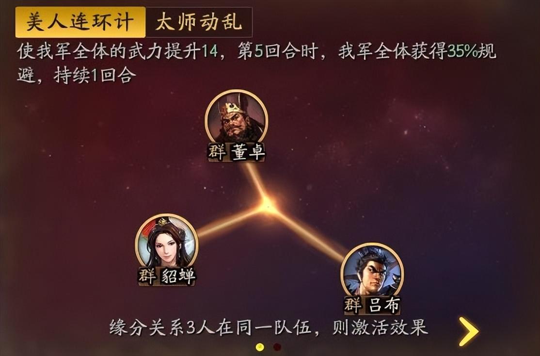 缘分关系之一美人连环计,剪不断理还乱的三角恋,一个被阴谋算计了的组合,一出没有胜者的悲剧。效果是提升全体14点武力值,相当于给名武将加了1.5红度;第五回合能获得35%的规避,相当于半个左慈的规避效果。总体看,这缘分比较鸡肋,这三位很难真的凑在一起,效果不敢恭维。