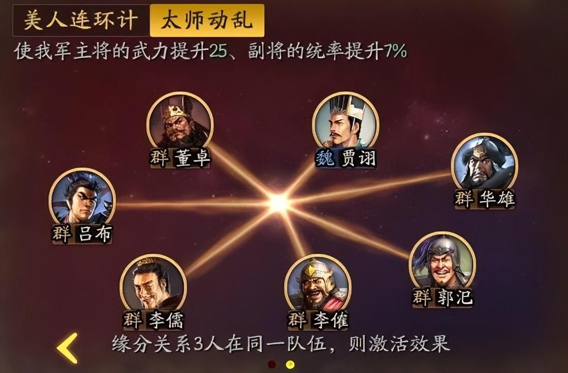 缘分关系之二太师动乱,足足有七人之多。除了太师外,还囊括了吕布、华雄两员猛将,贾诩、李儒两位谋士,以及李傕、郭汜两部将。游戏中贾诩、吕布、董卓算好卡,其他几位都是妥妥的材料卡。即便是能给主将提升25武力、副将提升7%的统率,也恐怕没人使用,至少现在是没有。