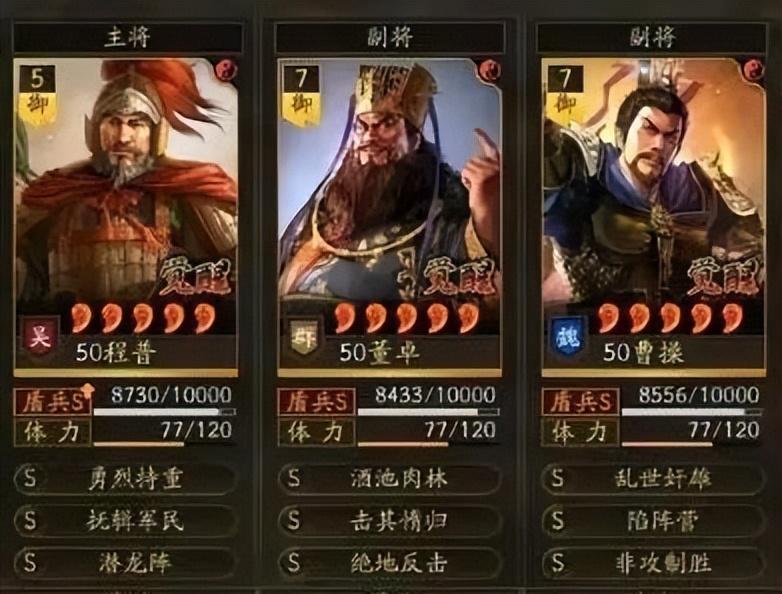 推荐阵容之二:程普+董卓+曹操的潜龙盾,程普为主将吸引火力,董卓反击制造伤害输出,曹操补增益、治疗效果。当然不是所有玩家都能有这么高的红度,有多少上多少都能玩。