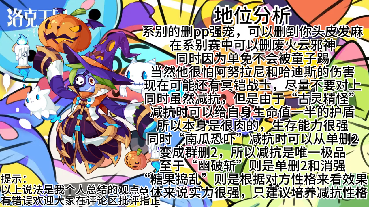 同时虽然减抗,但是由于”古灵精怪”减抗时可以给自身生命值一半的护盾,所以本身是很肉的,生存能力很强;同时”南瓜恐吓”减抗时可以从单删2变成群删2,所以减抗是唯一极品。至于”幽破斩”则是单删2和消强”糖果捣乱”则是根据对方性格来看效果。
