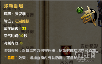 此架招是“罗汉拳”的架招,各种人群包括土豪都常用的一个架招,格挡招架成功挡住敌人会给自己增加“垂眉”BUFF,最高可以叠到10层,每层会给自身增加内外工防御,内外功的算法不一样内功好像每层加几十点内功防御,外功是按照当前外功防御的10%来相加,非常恐怖的一个防御架招,若本身的外功防御很高了配上这个招架简直就是画龙点睛,你的外防越来越多,多到外功玩家打你的时候根本打不动,架招适合群战和单挑,群战因为人多随时可以帮你把招架的BUFF叠上去,因为没叠一层都会有个存在时间,不然BUFF会消失,单挑可以针对一些内外功玩家有效的提高自身的内外防御,不过很多玩家建议用“小鹿”干柴烈火掌的架招也是可以的。
