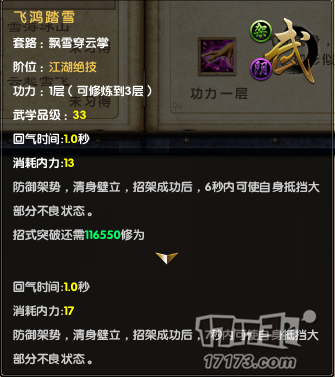 大世界里面的武学,这个需要你自己去买残卷咯,招架还是不错的,降低对方招式伤害,最高可以叠加到8层,也就是降低24%的敌人招式伤害,配上宝物和好的内功,对方拿你没办法,而且持续的时间的时间非常长达到15秒。