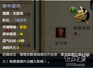 武当“太极剑”回复内力的架招,适合一些缺蓝的职业和武学,比如极乐谷的极乐刺非常的消耗内力,所以可以装上一个回复的内力还是不错的,内功威力越高回复的越多,打敌人打下你的招架回复几百都是有可能的。(有人说“反戈一击”比较合适,没钱用这个有钱你搞反戈小编不揽你)