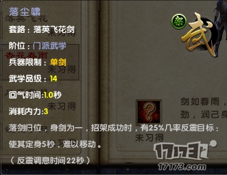 君子堂“落英飞花剑”的架招,整体来说很大众,和现在的武学架招有些雷同,特效需要几率触发,令其敌人5秒内定身无法移动,这个很不错适合虬枝这样的,禁轻功还可以移动,定身就比较邪恶了。(此架招可以和其他套路共用哦)单剑我觉得最适合了,近战谢列都适合。