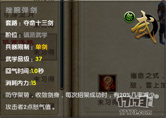 极乐谷镇派武学“夺命十三剑”的架招,特点就是减人怒气值,这个也是要几率触发的,对于一些需要怒招爆发的“雪斋剑法”“辟邪剑法”这样的有点小克制,因为比较都有点需要靠怒招吃饭,除了减少怒气值我没什么用处了。