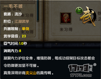 江湖武学“流沙”武学里的架招,好搞又省钱,没钱可以直接用副本活动给的绿点兑换哦,此招架类似“弥勒垂眉”但是当然没绝学的好拉,这个也可以用用,招架成功给自身增加防御。