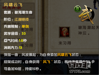 桃花岛“碧海潮生曲”的架招,招架成功给自身增加移动速度可以叠加到10层,最高可以达到50%的移动速度很叼了,持续时间15秒适合那种游走跑路的玩家。