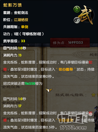 江湖绝技“金蛇剑法”的架招,触发招架BUFF已经叠到3层让敌人中招以后定身2秒,随着等级提升定身的时间也会增加,非常不错的一个招架。