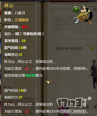 江湖绝技“八卦刀”的招架,可以为自己增加外功防御而且加的非常多,就是持续时间太短,1层的时候加22%的外功防御,不知道高层以后会加多少,针对外功玩家此招架就是一个毒瘤。