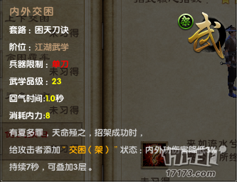 大世界“困天刀诀”的架招,招架成功降低敌人内外功伤害,也就是所谓的近身和内功伤害,持续时间段层次低,不如全真架招和弥勒要么用小鹿。