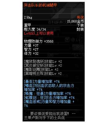 突击护腿又称暴走腿,属性:物理防御力+4566,力量+45,智力+33,体力+42。黑暗武士(男):技能Lv+2技能Lv+2技能Lv+2技能Lv+2【走]力量增加率+7%对出血状态敌人的攻击力增加率+7%力量增加率+7%攻击力增加率+7%力量和智力增加量+7%!根据测试,突击护腿还会增加7%的暴走技能攻击力,4%左右的提升,这也是导致暴走腿如今天价的原因,暴走腿现在稳定6500W以上,产量不高,需求量很大。