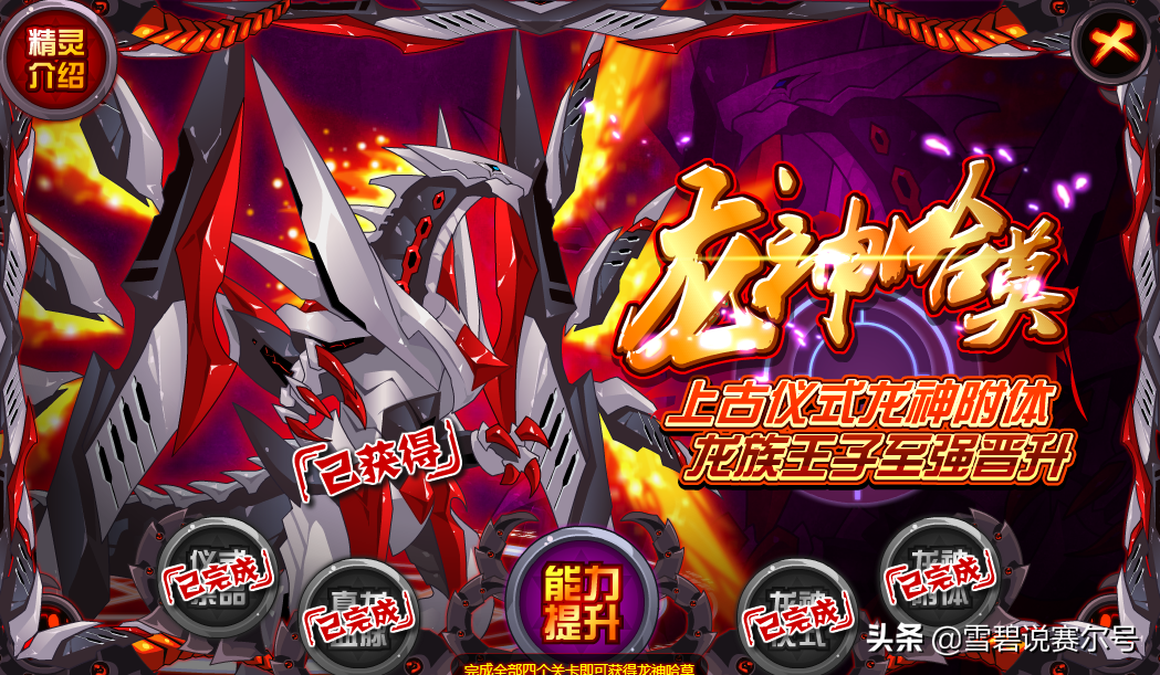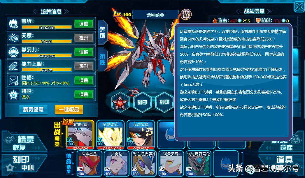 对手使用属性技能则自身当回合免疫异常状态和能力下降状态,使用攻击技能则回合结束时随机附加给对手150-300点固定伤害(boss无效)。专门为PVP而设定出来的新形态,定位巅峰主流。反制效果强力,不管是对上属性控狗还是攻击类精灵,只要我还活着,那么就不可能轻易被击杀。最后一条效果算是给龙神给足了能力,虽然我不能控,但是我有我能站得住的办法。750也不是吹出来的,一线精灵就该有身份和实力。一条魂印就能压死诸多活动精灵,贺岁档强化也算是给了一个新巅峰。
