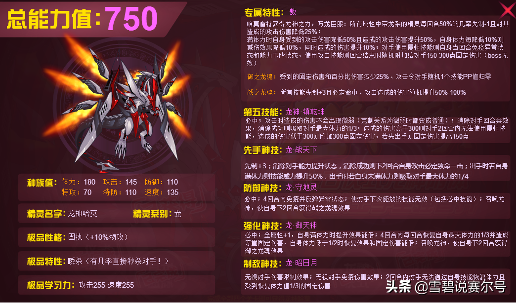种族方面:750已经算是拔尖,上巅峰主流没有任何问题。体力180,攻击145,防御110,特攻70,特防110,速度135。体力方面180已经达到了肉盾级的要求,当前排行第三(第一青龙完全体、第二库贝萨完全体)。攻击145并驾齐驱光螳螂,全赛攻击力排第二,伤害绝对可观。双防110,算是具备了标准700以上的水平,算是稳定,血量突出,培养重心建议加到攻体或攻速。速度135,挤进当前赛尔号速度第五的存在,并驾艾夏拉、邀天之煞,攻速流或体速流配合技能先制并不见得会比艾夏拉在速度上要弱多少。