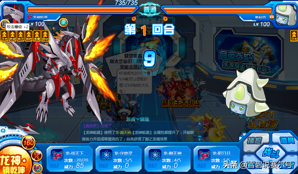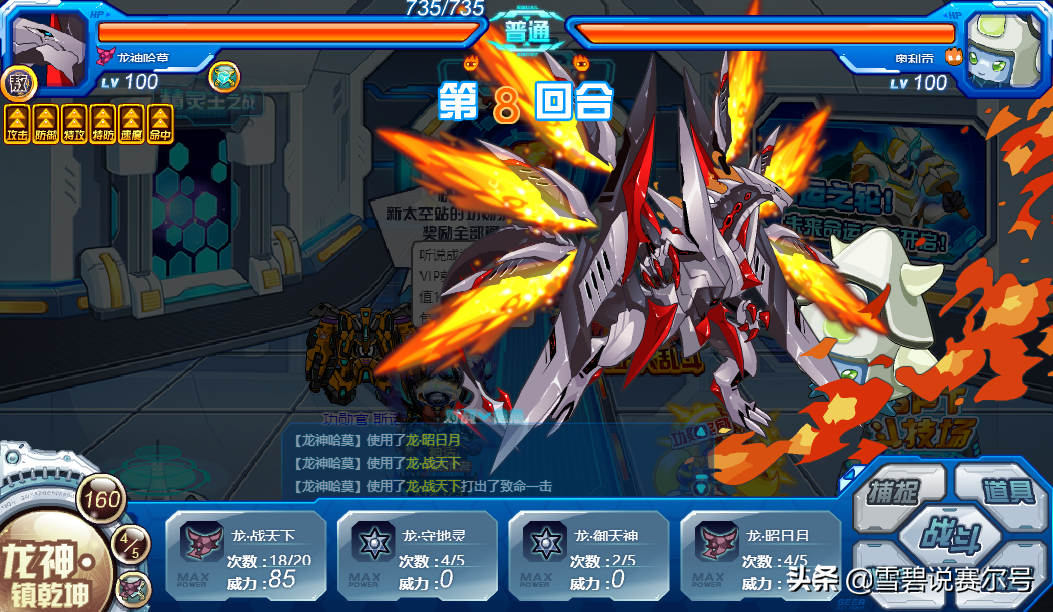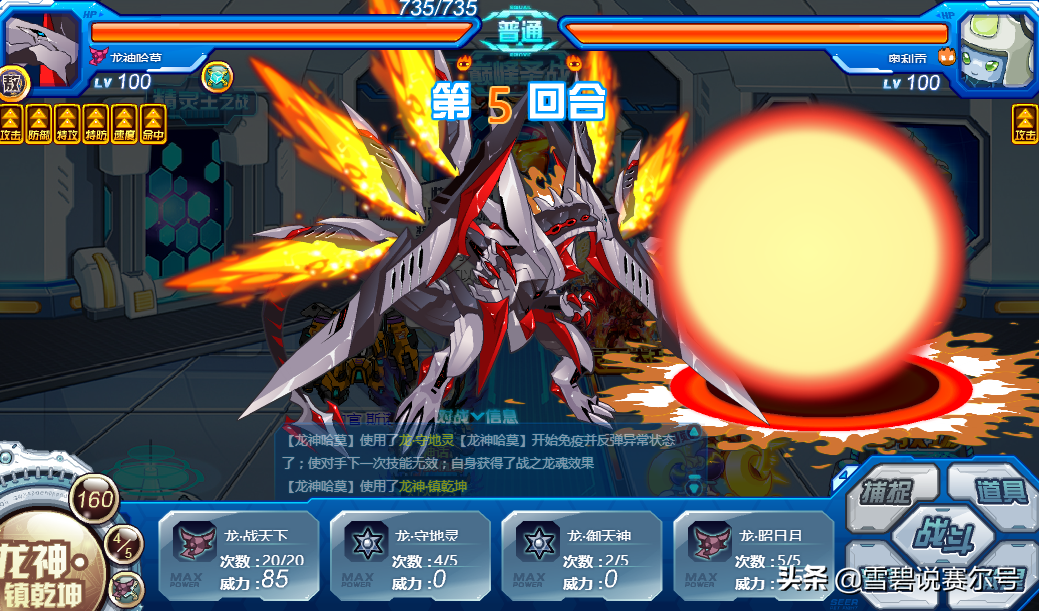 必中;全属性+1,自身满体力时提升效果翻倍,4回合内每回合恢复自身最大体力的1/3并造成等量固定伤害,自身体力低于1/2时恢复效果和固定伤害翻倍;召唤龙神,使自身下2回合获得御之龙魂效果。续航技能,只要不被消回合,开出龙魂效果瞬间打回优势,站撸能力得到稳定,接什么技能都有充足的优势。