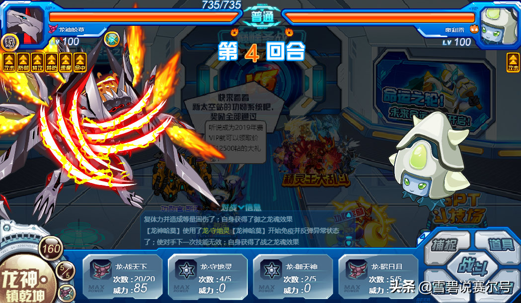 防御神技:龙守地灵 必中;4回合内免疫并反弹异常状态;使对手下次施放的技能无效(包括必中技能)召唤龙神,使自身下2回合获得战之龙魂效果。龙威效果,反弹异常、拉起增伤,但如果用了我方或敌方这招,很明显接下来就要输出,切出机盖有可能会被针对。