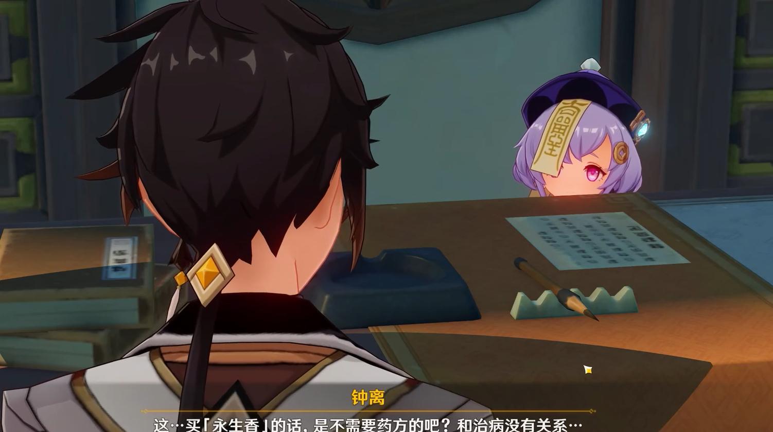 当旅行者和钟离见到七七并询问有没有“永生香”卖的时候,半个脑袋从柜台头探出。小声的说道“只要你给我药方我就能给你抓药”。这是七七给自己的敕令。但是众人只知道永生香,并不知道药方。