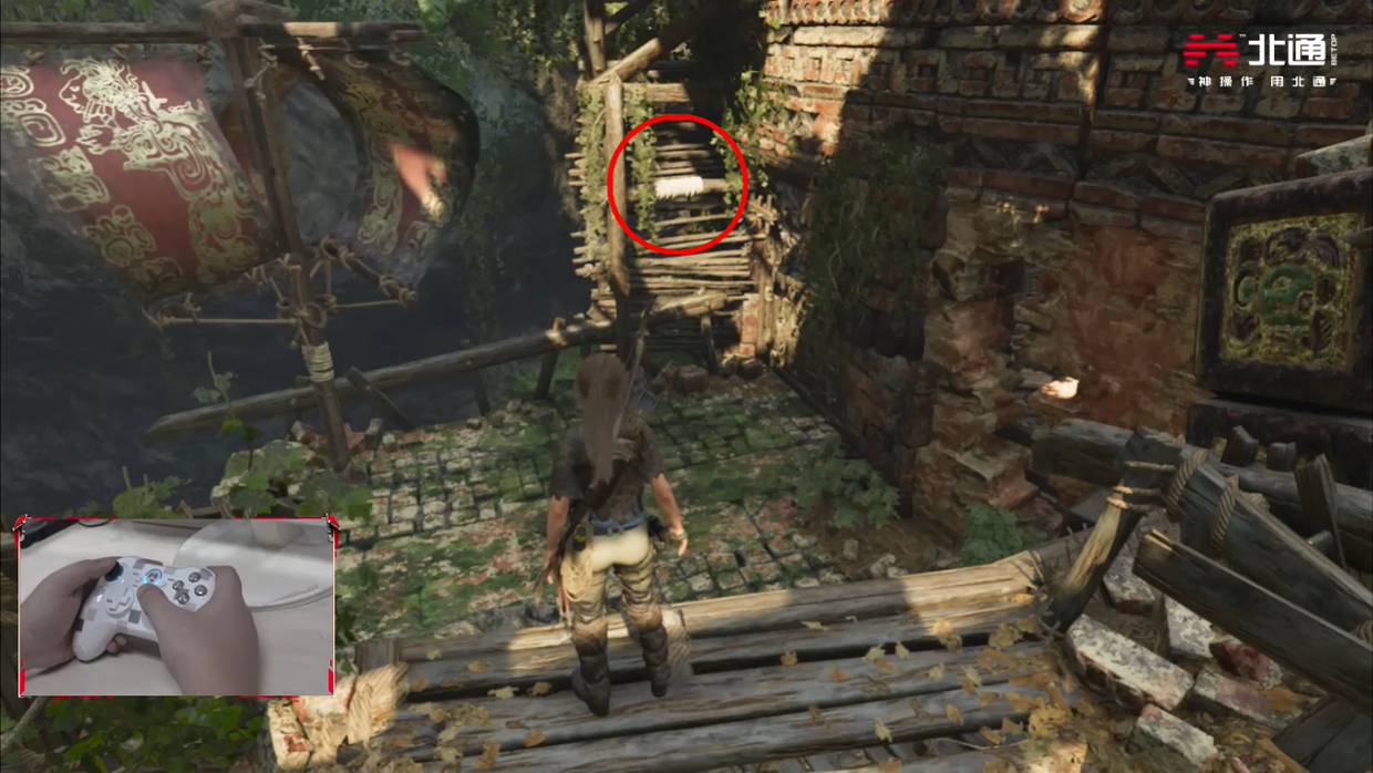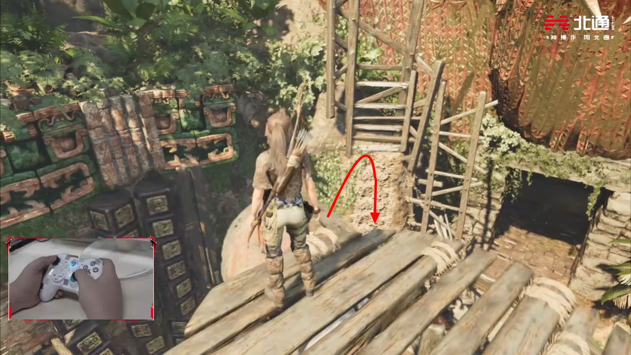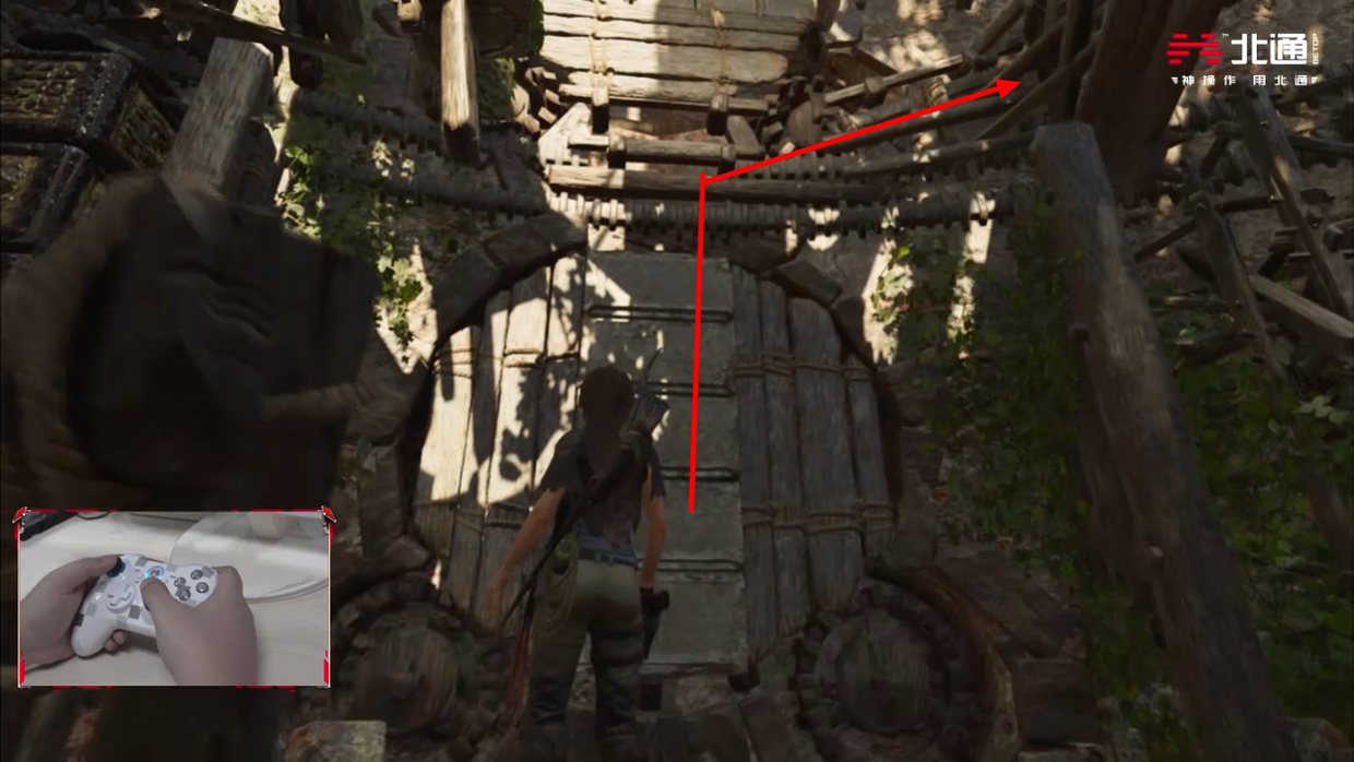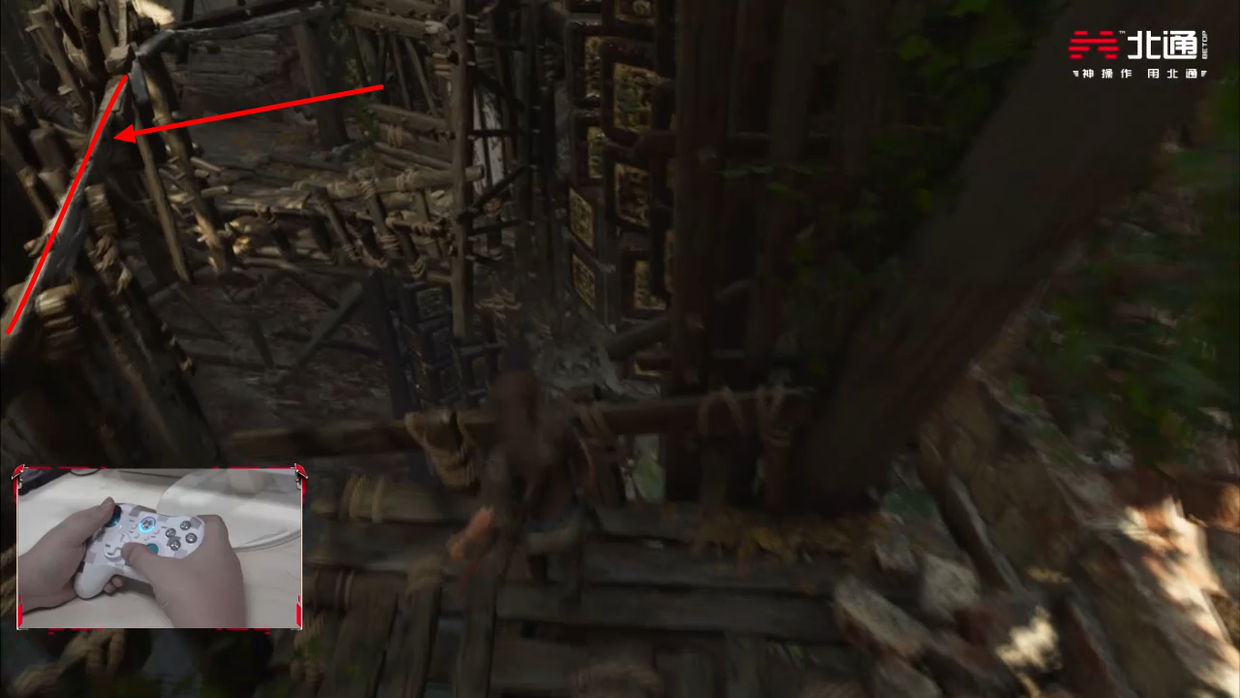 走到顶部机关往外伸出的木条上,当位置转到图示处后就对面跳即可,再经历一段垂降与攀爬后就可以到达目的地。