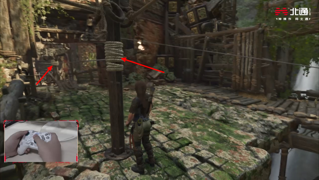 在门开启的同时,来到左边缠着绳子的木柱这里,用绳索将其与开门的机关连接。