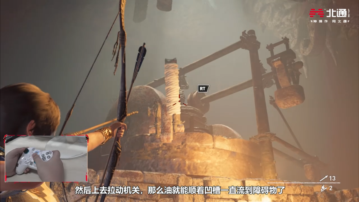 这里只要用弓射出绳索拉动机关,让油流出。