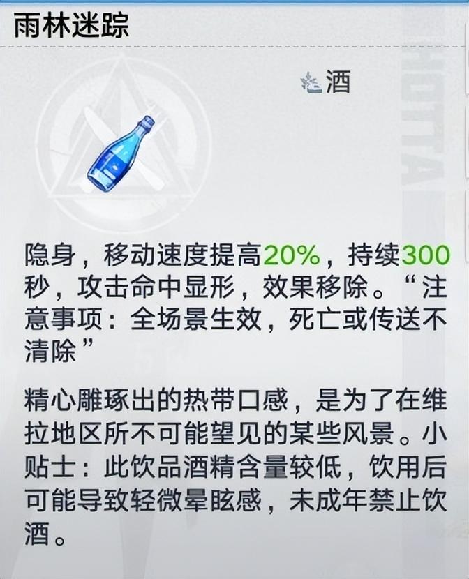 在灰域中是不能组队的,只能单人探索,有人说战力太低了不敢去又很想去看看,这里给大家分享一个好东西——雨林迷踪。使用这款酒类道具后能有隐身效果,同时能够提高20%的速度,有了它我们的灰域探索过程将会更加安全高效。