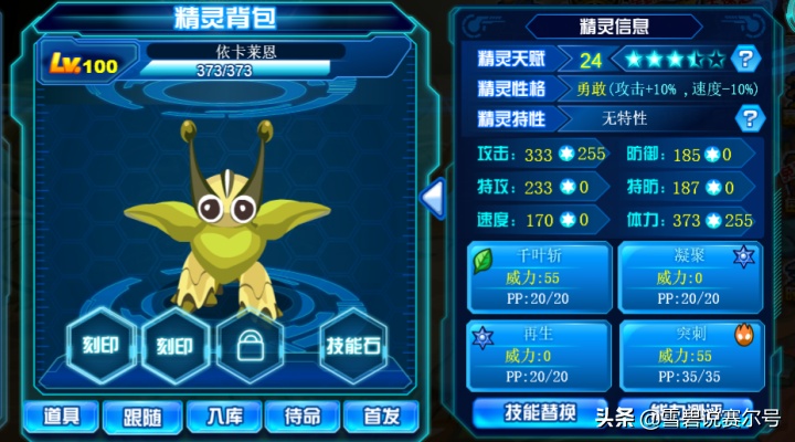 但说真的,在09年如果练对了精灵,前期不管打PVP还是PVE都十分轻便。依卡莱恩确实如图鉴攻略所说,虽然最大本攻技能的威力只有125,但搭配+2攻击就不是开玩笑,而且还有【寄生种子】+【再生】,续航也没有问题,真是5星级精灵。
