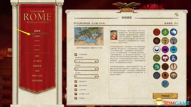 要设置新的战役,在主菜单上选择新游戏 → 帝国战役,然后就可以选择要扮演的派系和作其他的战役选项。