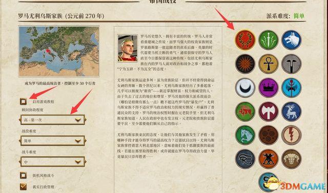 选择扮演罗马尤利乌斯家族,可以启用游戏教程,学习全面战争基础玩法。