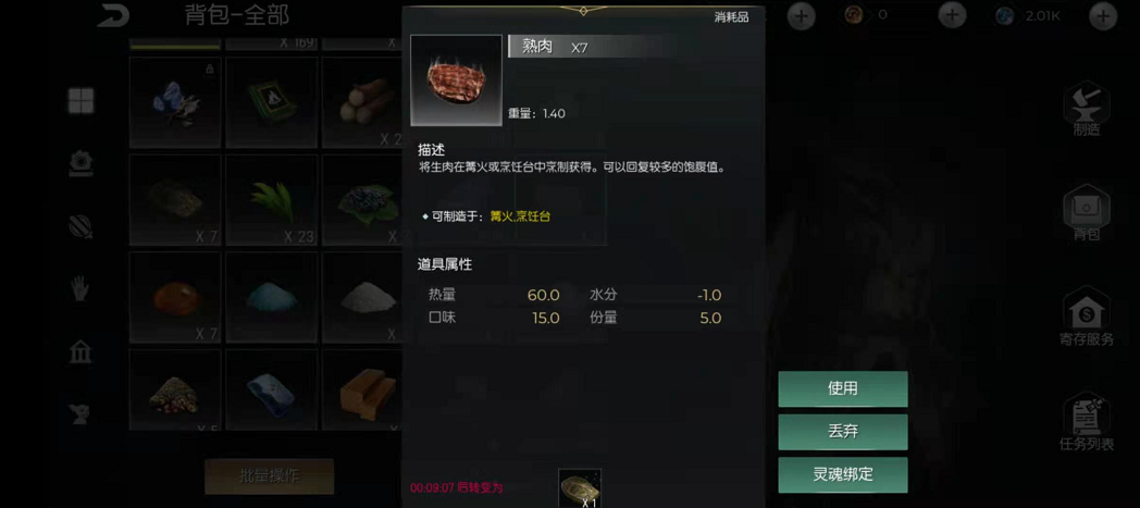 先来说说食物值吧,玩家可以造出基础武器后猎杀绵羊、麋鹿等低级生物,切割它们的尸体获得生肉,然后放到篝火或者烹饪台做成熟肉,食用后能恢复大量食物值,就不用辛苦采浆果来充饥了。