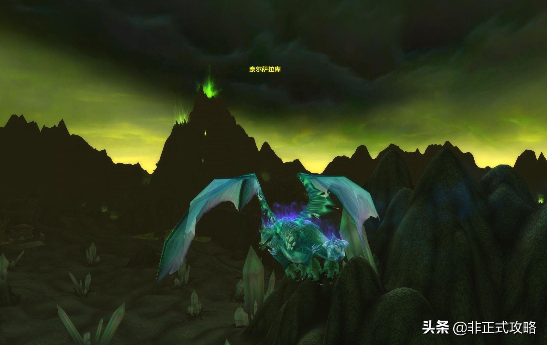 ④、上鸟飞向灵翼平原和龙喉要塞的上空,寻找这条体型较大的非战斗型虚空龙——奈尔萨拉库,鼠标移过去显示名字为黄色。找到他,跟他对话交任务,接到下一步【70】寻找奈尔萨拉库的故事。