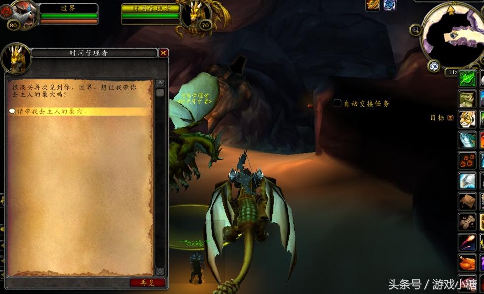 然后,根据任务指引来到时光之穴,在时光之穴门口点这头龙,骑上它,自动飞到时光之穴里边。也可以自己骑坐骑进去,不过我感觉让它带进去还方便点。