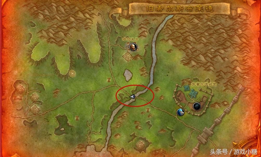旧希尔斯布莱德:进副本之前,记得要先转换成英雄模式,好像只有英雄模式才会掉落。进入副本后,直接奔图中红色圆圈的位置去就行了,卡洛斯必定走这边的一座桥,骑着白马带着狗。