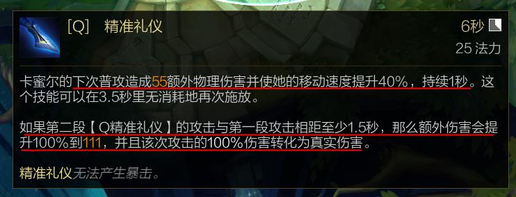精准礼仪(Q技能):卡密尔下次普攻造成额外伤害,二段Q将一部分转化为真实伤害。Q技能是青钢影的主要伤害手段,二段转化真伤使其即使不出穿甲装备,在面对护甲高的英雄也有着很大的威慑力。很多英雄强化普攻的技能都能使下次普攻提升50点攻击距离,如诺手的W,盖伦的Q,青钢影的Q自然也不例外,合理的运用额外的攻击距离配合加速能达到无伤蹭血的效果,让我们在线上更好的打出优势。