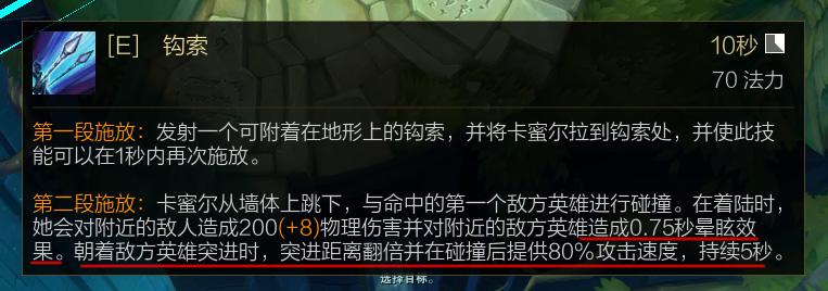 钩索(E技能):青钢影在灵活的特性方面就体现在E上,E技能的超远距离位移提供了逃跑能力和追人能力,1500码的直线位移距离比三个闪现还要远。在野区如果一个落单的ADC被青钢影盯上,那么能逃生的可能性基本为零。