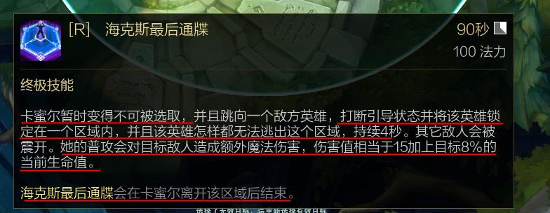 海克斯最后通牒(R技能):青钢影的主要留人手段,跳起来的时候会有一小段无敌(无法被选取)。