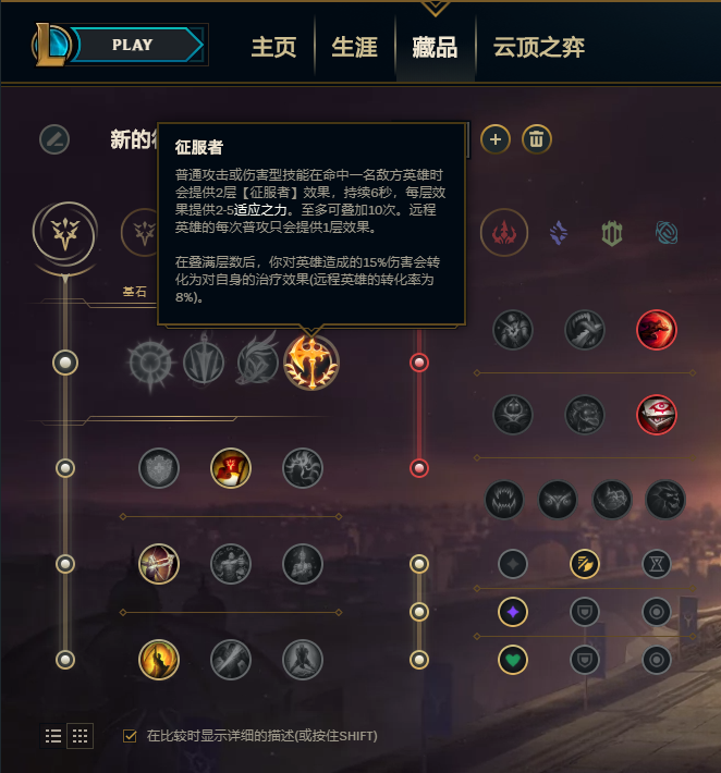2、征服者:当前版本最强天赋,叠满后提供高攻击高额的回复。在面对战士坦克英雄时仅仅依靠强攻的伤害往往是不够的,战士坦克往往不仅有着高抗性高血量,同时也有着不俗的伤害。在对拼中很多时候会发现,打着打着,对面还没掉多少血,自己的血条就要见底了。而征服者提供的高额回复让我们持续作战的能力提升了一个档次,额外的攻击力也能提高不少伤害。