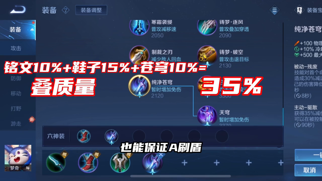 ·开局一把匕首冷静之靴叠C0日冕苍穹,这样加上铭文就是35的冷却缩减,即使没有蓝buff,在前期质量也可以轻松的叠起来,也能保证A刷盾。(线上)梦奇前期就算堆伤害伤害也不会很高,不如先把坦度拉上来,然后补抵抗之靴减少控制。