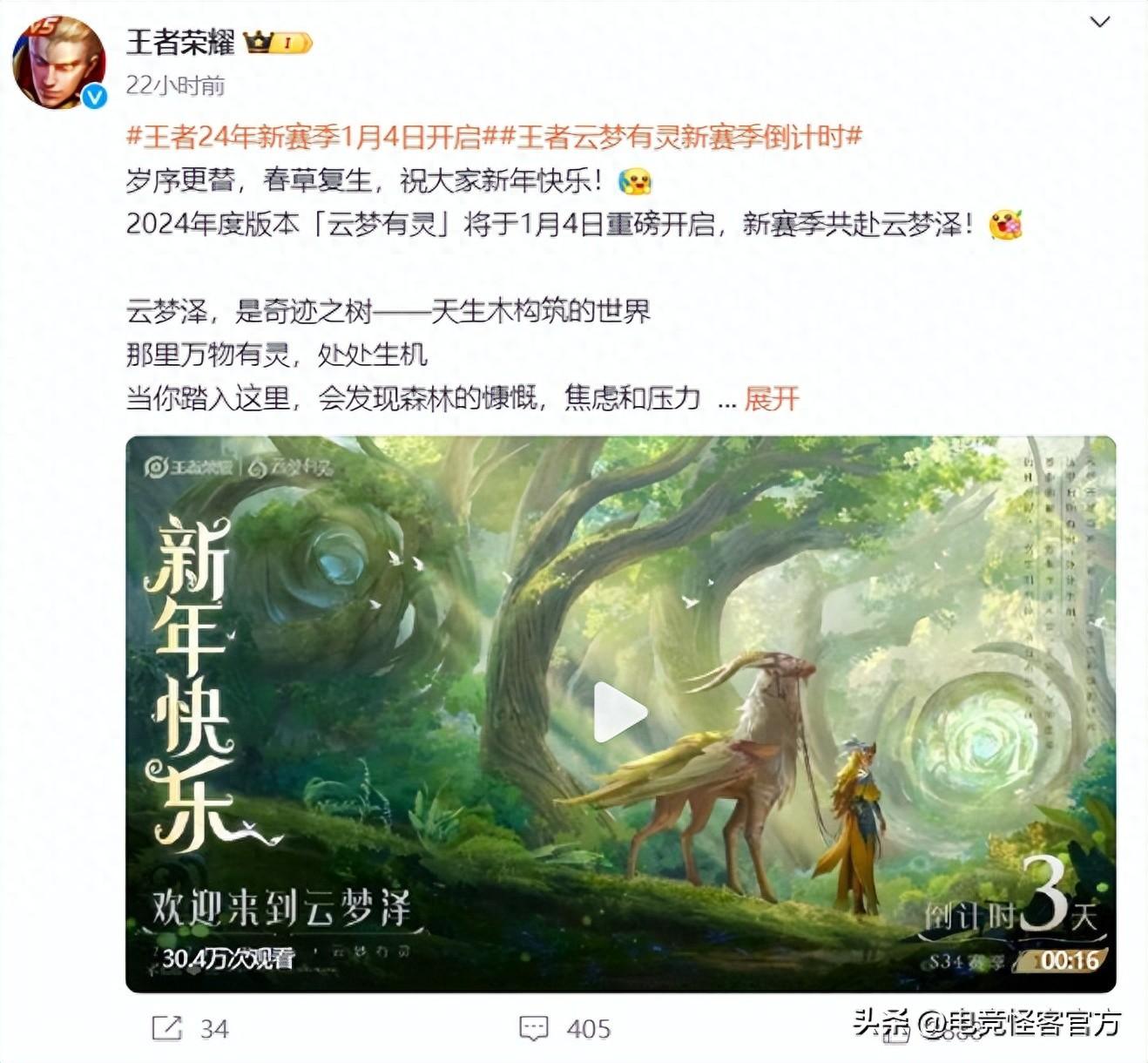 就在昨天,王者荣耀官方微博发布了S34新赛季的预热视频。和怪客此前预测的一样,S34赛季会在1月4日开启。不出意外的话,明天晚上11点30左右,正式服就会关闭排位模式,留给大家上分的时间只有今天+明天啦!还没上王者的小伙伴要抓紧咯。