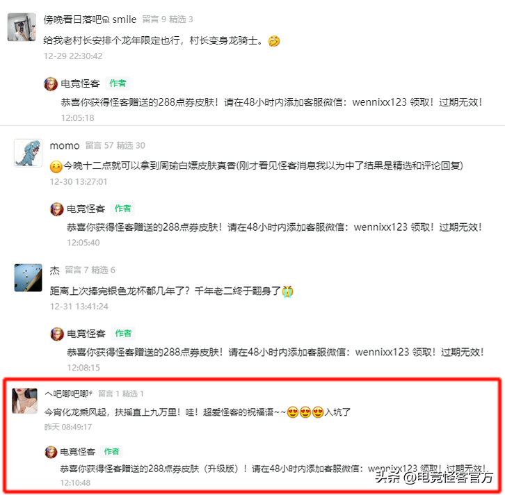 放假的时候给大家安排了免单福利,留言被抽到的小伙伴,开奖前在怪客这里入手了【澜fmvp新皮肤或返场皮肤】,均可或得【免单】奖励!今天给大家公示下假期的获奖名单。
