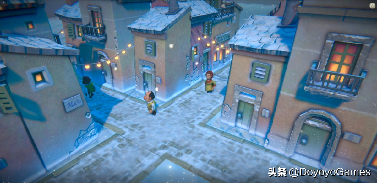 冬天的时候,建筑窗户会亮起来,建筑之间也会有灯旗相连。