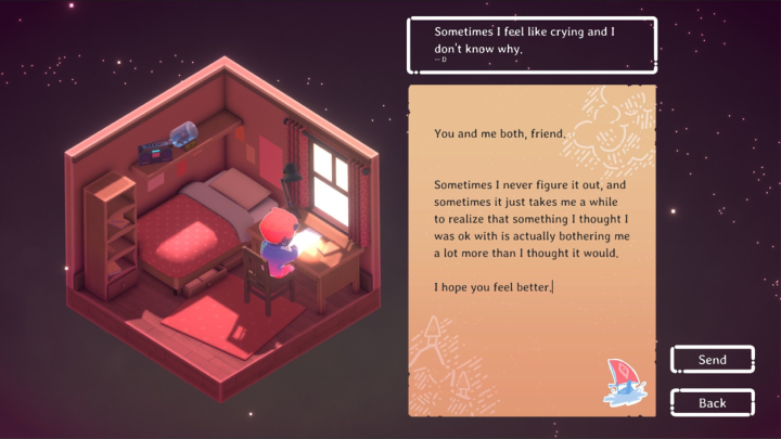 words)是一款非常温馨的漂流瓶游戏,玩家也可以把这款游戏当作是一个树洞,可以在这里写下自己近期的烦心事或者小秘密,你写下来的东西可能会被其他的玩家收到,他们也会就你的问题给出认真的回复。当然了,玩家也可以收到别人的信件,你也可以给他们一些人生建议或者鼓励,当他们收到了你的回复之后是不可以再次给你写文字的,而是会送你一些漂亮的贴纸,玩家就可以用这些贴纸去装饰自己的房间了。帮助别人获得贴纸,装饰自己的房间,这样的感觉真的会让人感到非常治愈。