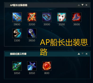 为什么先讲出装思路呢?因为这个出装思路是与AD玩法的最大差别所在,首件不要先做出成装巫妖,先出耀光和小科技枪两个1050的装备,强化船长的平A(同时也是强化Q技能),这是解决AP船长前期过于劣势的一个关键,然后首件成装要先做出冰枪,合成比较平滑,对不断需要技能清线消耗的船长来说蓝量和20%减CD也非常重要,然后做出巫妖,最后就是鬼书面具帽子这几件装备,如果中间实在难以过渡可以选择出一个燃烧宝石,后期再卖掉,出装思路挺多变的,但是冰枪和巫妖是必须的。
