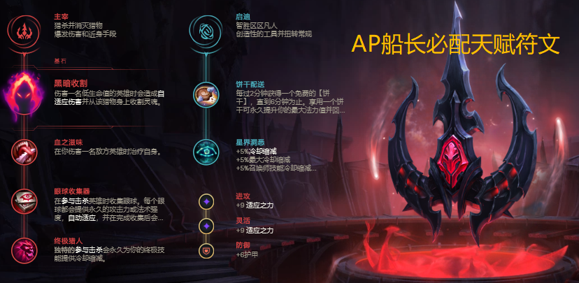 在天赋符文的选择上要选择黑暗收割,这是必须的,因为出了AP之后其实大部分伤害都在大招上面,需要用黑暗收割来补一些爆发,主系选择主宰系黑暗收割、血之滋味、眼球收集器以及终极猎人,血之滋味线上换血必备,眼球收集器增加一些伤害能力,终极猎人对于频繁需要使用大招的AP船长来说是很好不过了,副系选择启迪系饼干配送以及星界洞悉,饼干增加船长在线上的续航能力,星界洞悉是非常重要的,AP船长极其需要冷却缩减。