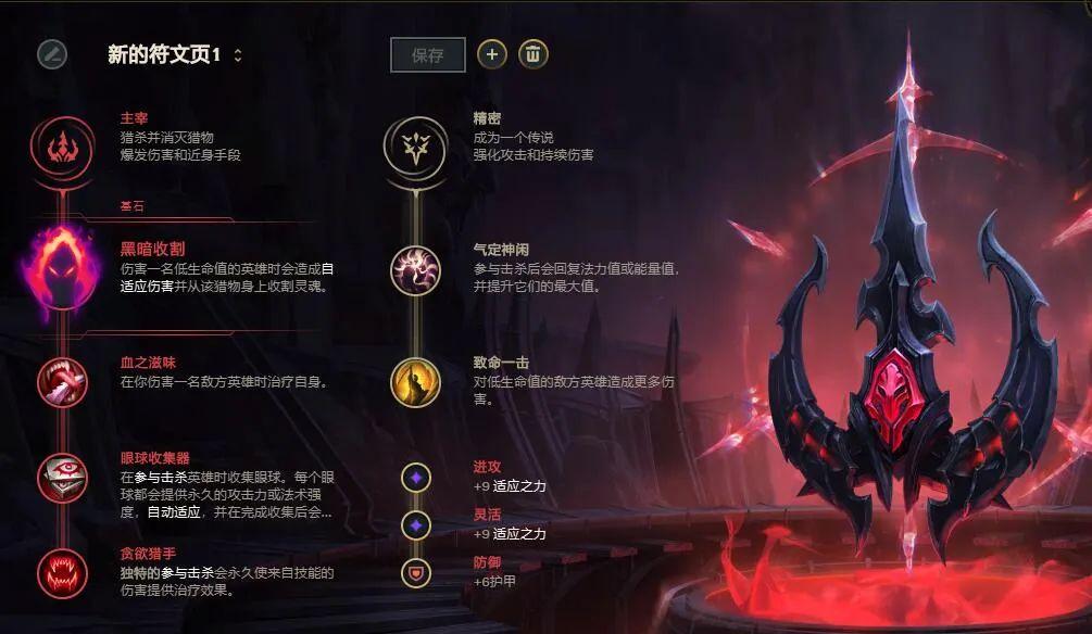 主系符文:黑暗收割+血之滋味+眼球收集器+贪欲猎手