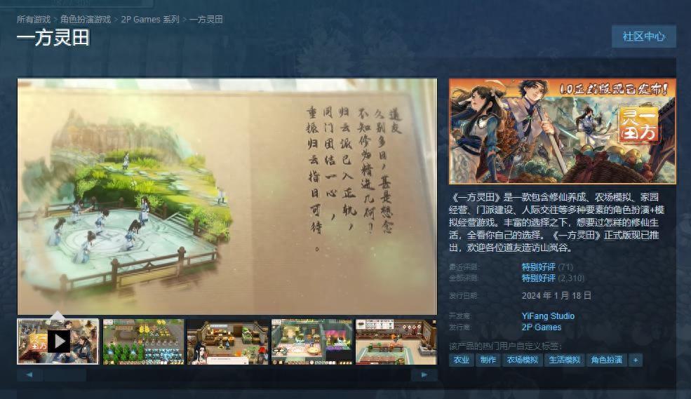 1月18日,角色扮演模拟经营游戏《一方灵田》1.0正式版今日正式发售,玩家在EA版本的存档可以继承至正式版,Steam上线-20%折扣价46.4元。《一方灵田》是一款可以种田、可以修仙、可以经营山谷、还可以和诸多性格各异的NPC共同振兴门派的生活模拟游戏。