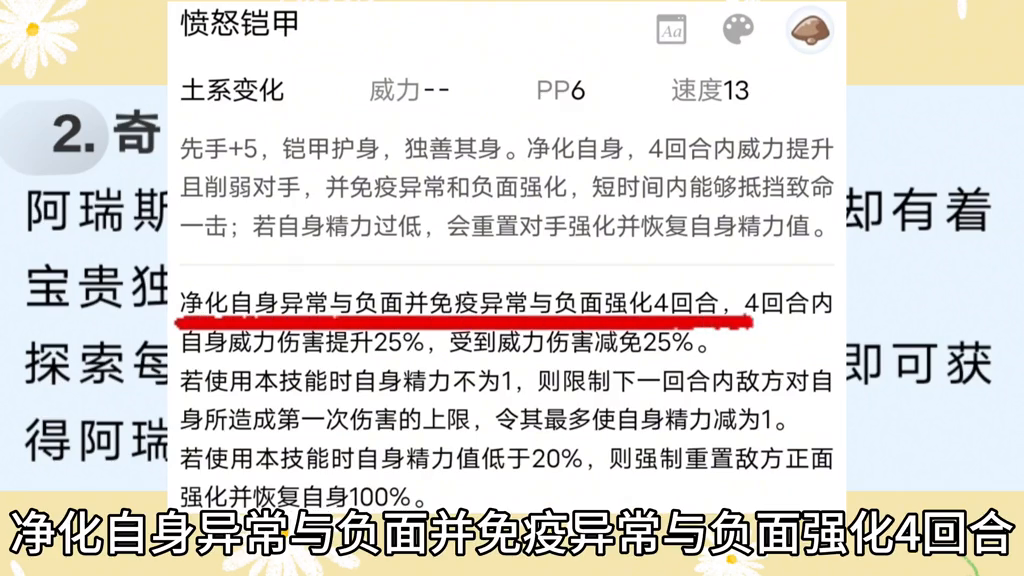 ·第三个活动:速防控技能愤怒铠甲。净化自身异常与负面并免疫异常与负面强化四回合。在四回合内自身威力伤害提升百分之二十五,并减免百分之二十五的威力伤害。若使用本技能时自身精力不为一,则限制下一回合内敌方对自身所造成第一次伤害的上限,令其自身精力最低为一。